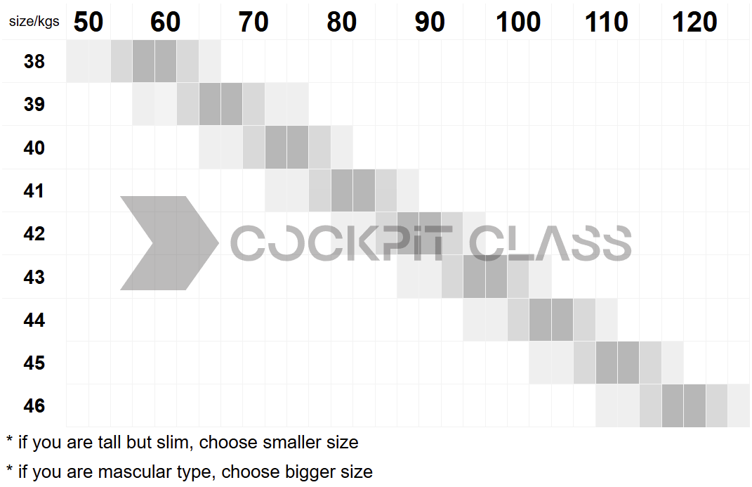 When in doubt between two sizes, opt for the larger one. Cockpit Class prioritizes your comfort, and choosing the bigger size ensures an ideal fit, granting you the freedom to navigate the skies with ease.