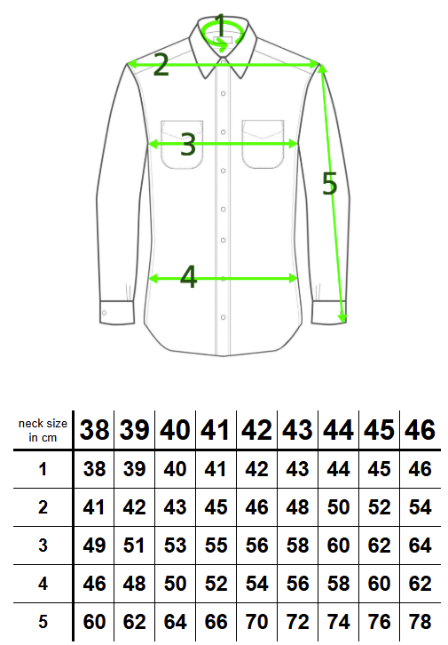 For a perfect fit with Cockpit Class, consult our user-friendly sizing table. Measure your current shirt precisely and order accordingly. Our dimensions come with a +/-1cm tolerance, ensuring an impeccable fit tailored to your preferences.